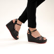 La suela roja, grabada con el monograma, aporta un sello distintivo y discreto. Y aunque su altura estiliza la figura, la inclinación interna de 5 1⁄2 cm brinda una comodidad inesperada, ideal para quienes desean lucir más altas sin renunciar al confort.