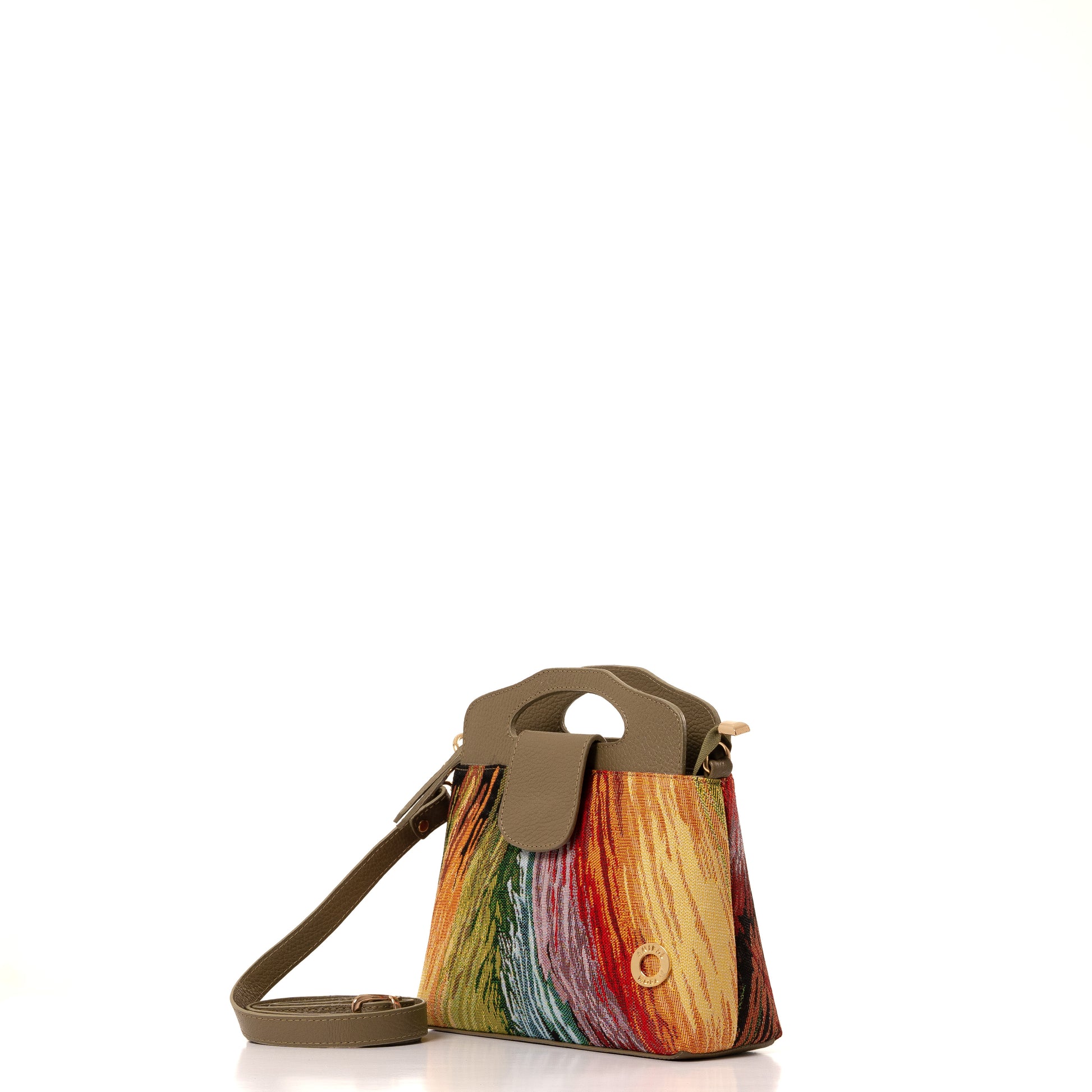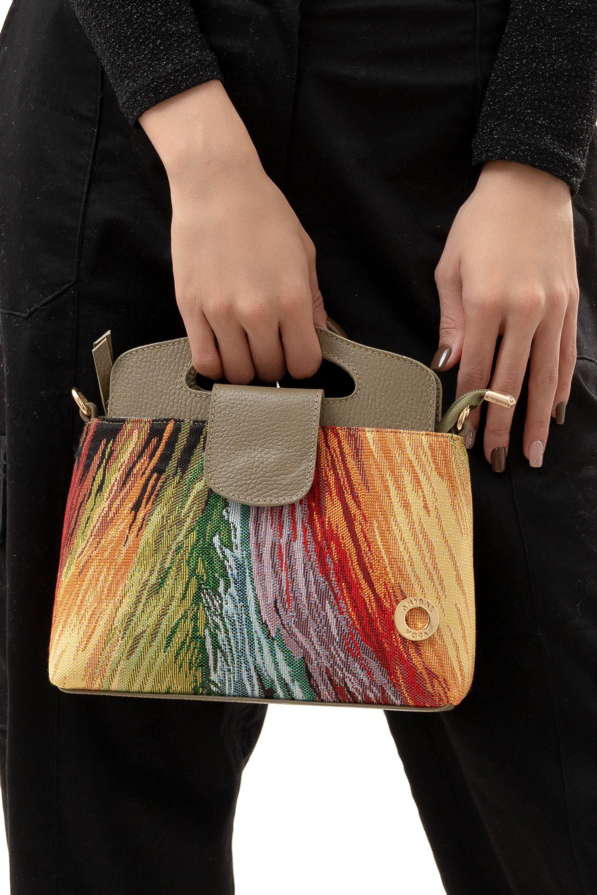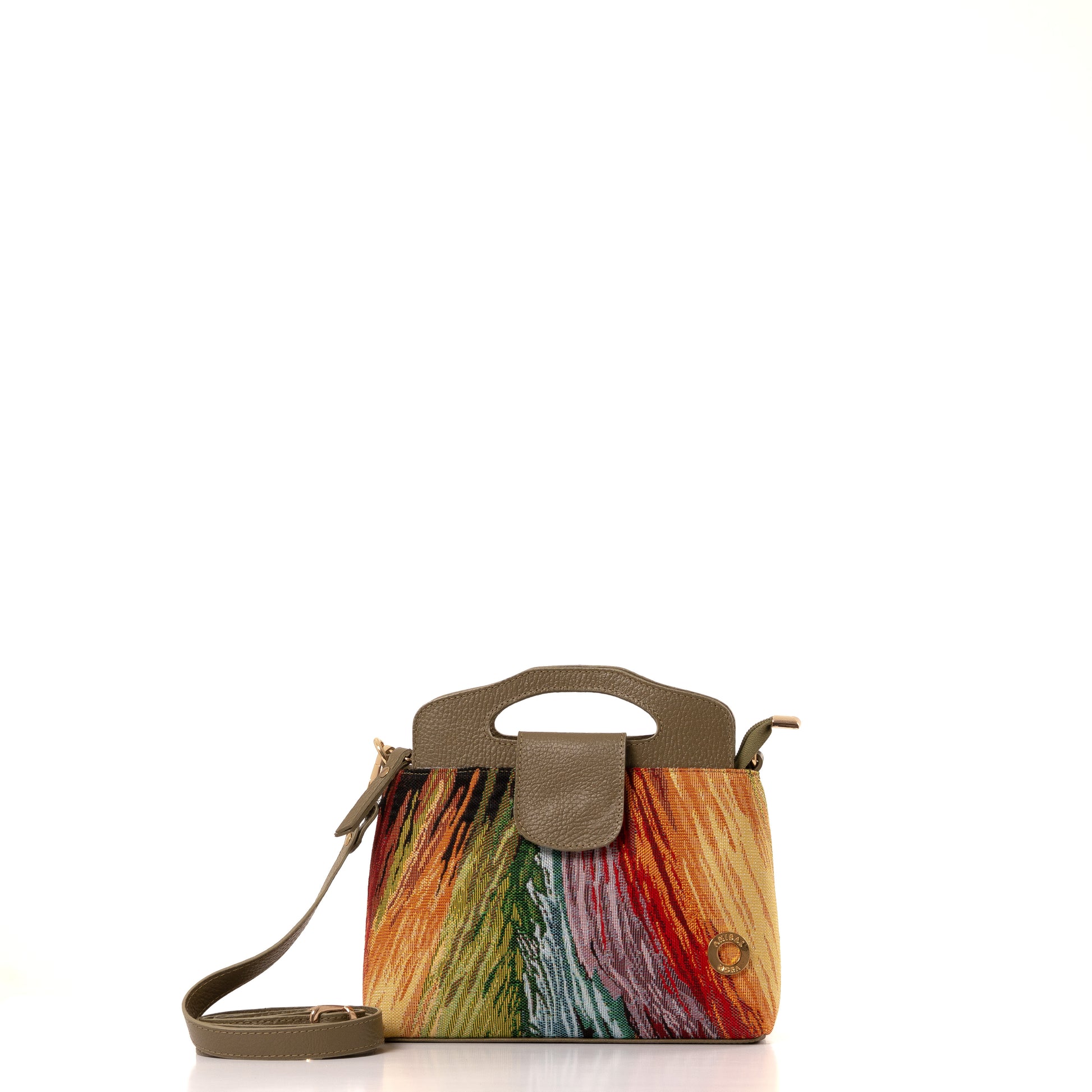 Cuerpo en textil tejido en telar con piezas en cuero complemento ideal, placa circular con el nombre de la marca.