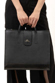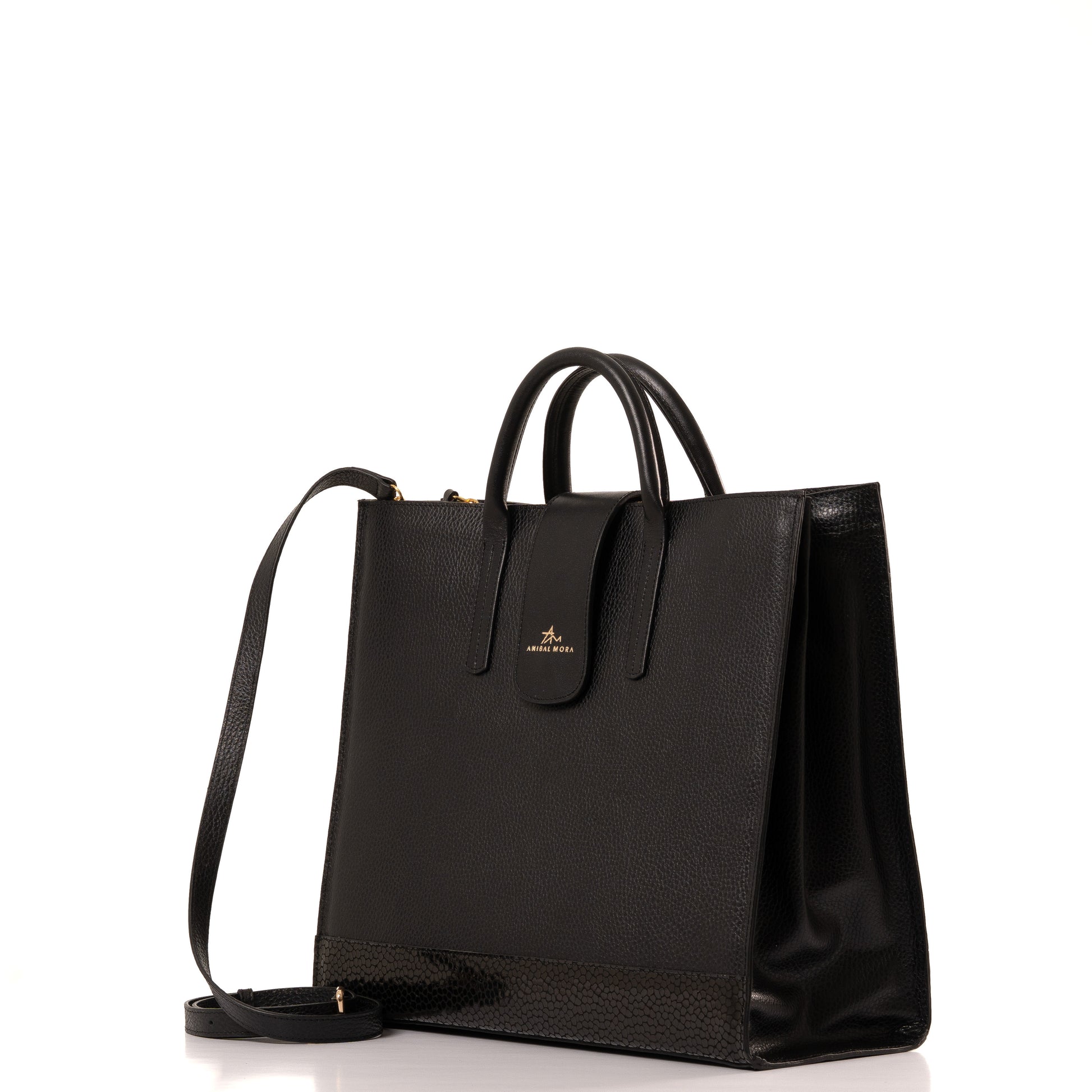 Cómplice Leal es una pieza estructurada, minimalista y profundamente funcional. Elaborada en cuero negro de textura suave combinado con cuero liso, su estética sobria se realza con herrajes dorados y una cremallera metálica fina que aporta un toque de lujo silencioso.