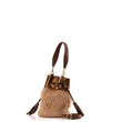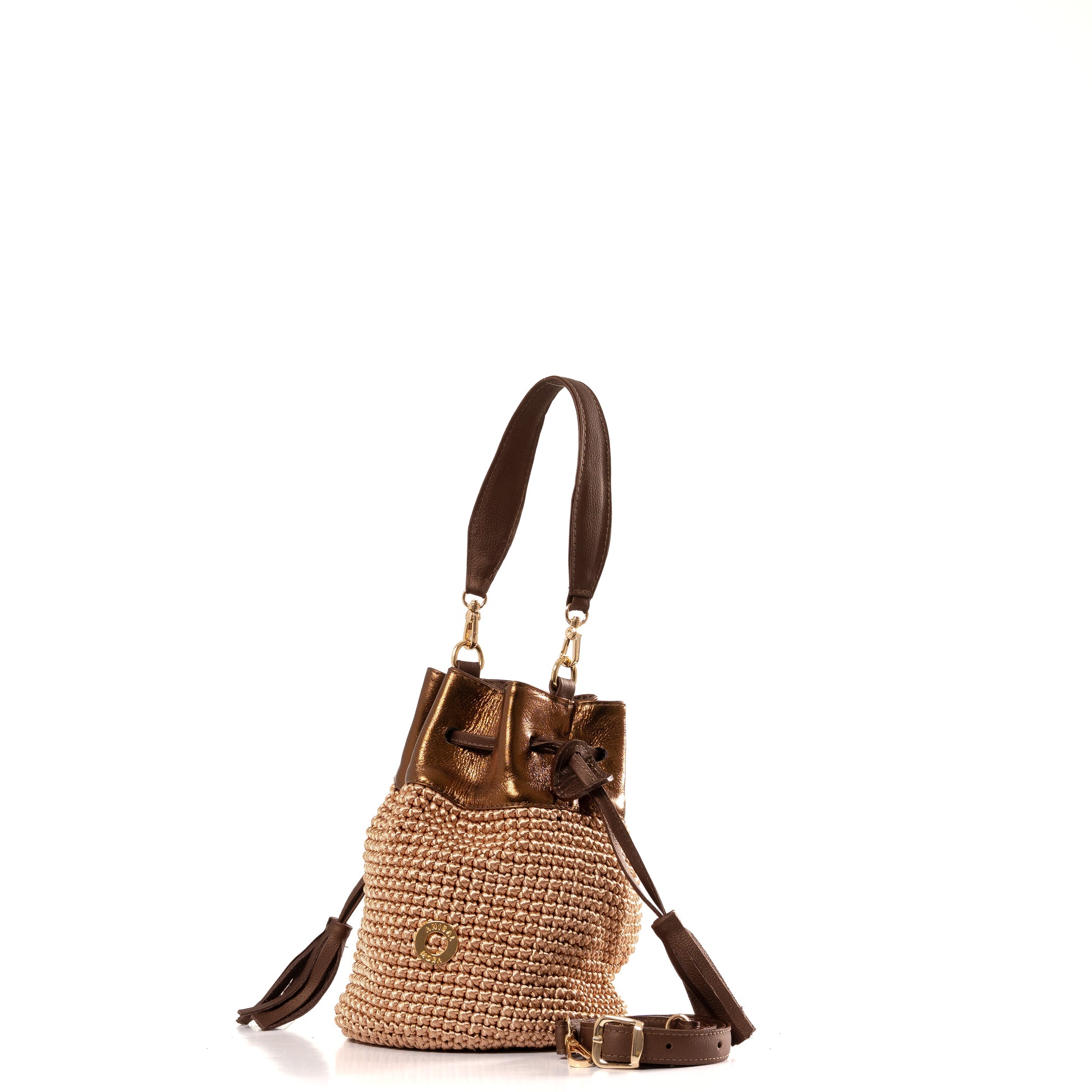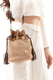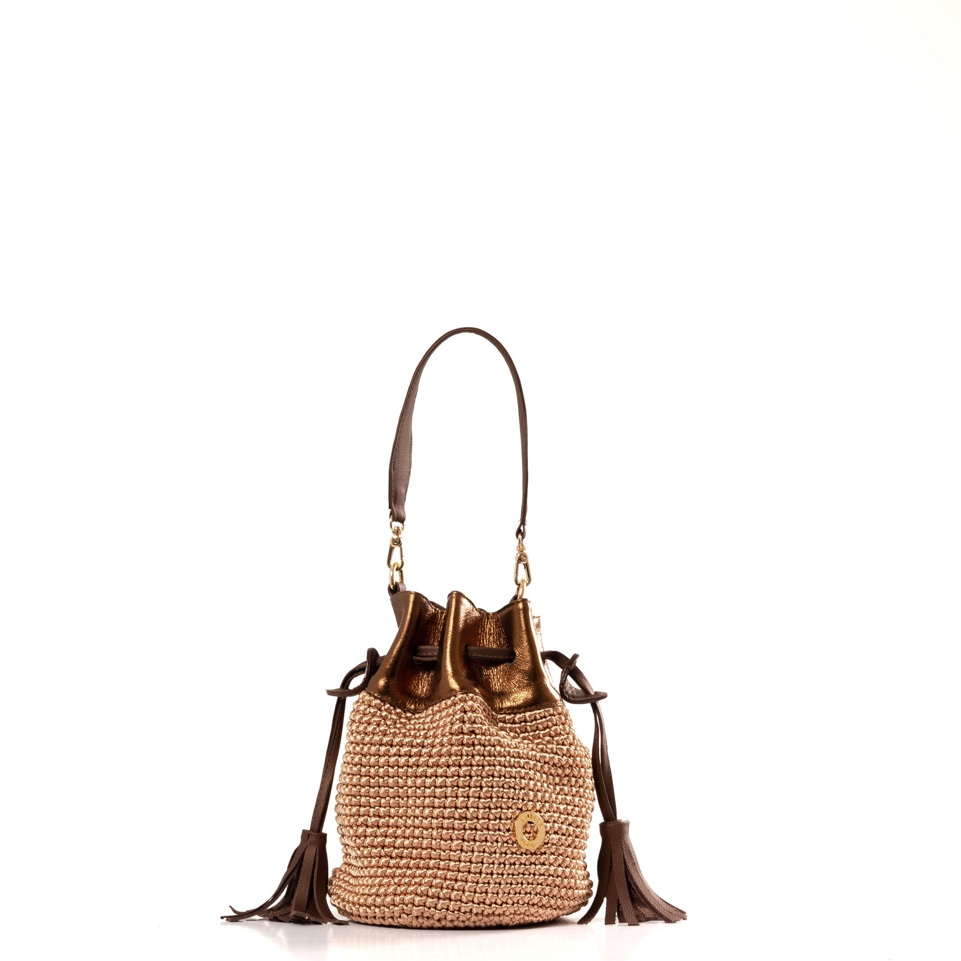Cuerpo en hilo tejido manualmente con aguja de gancho que hace complemento con piezas en cuero,placa circular con el nombre de la marca.