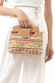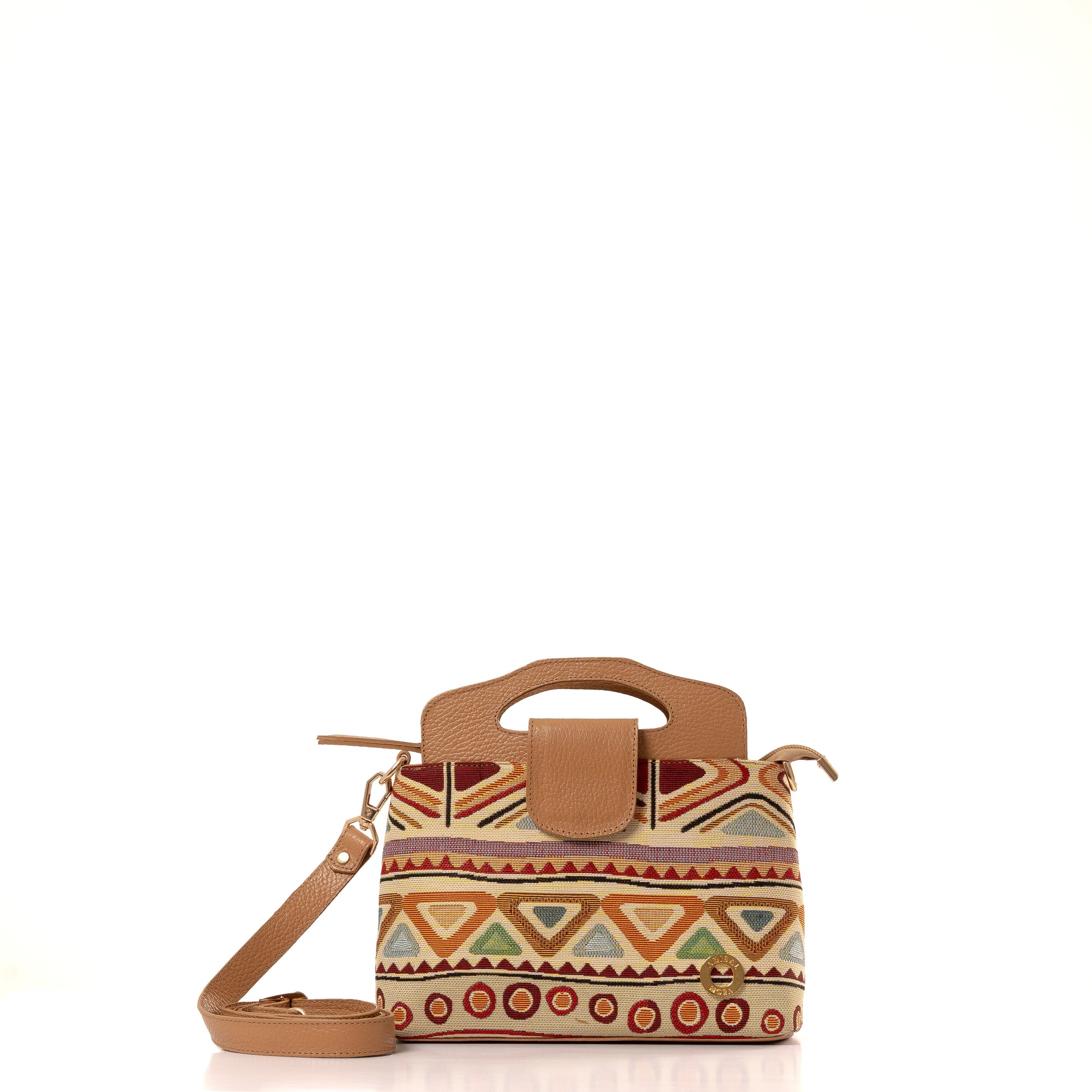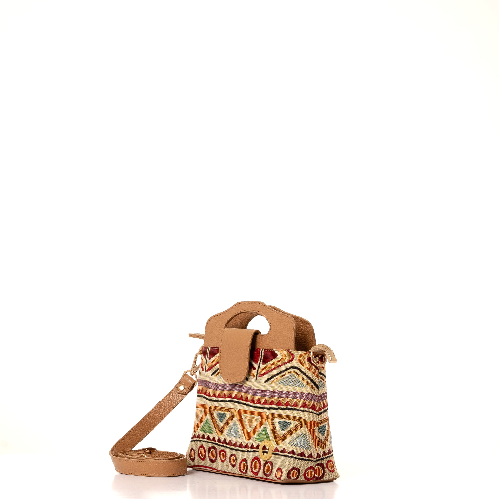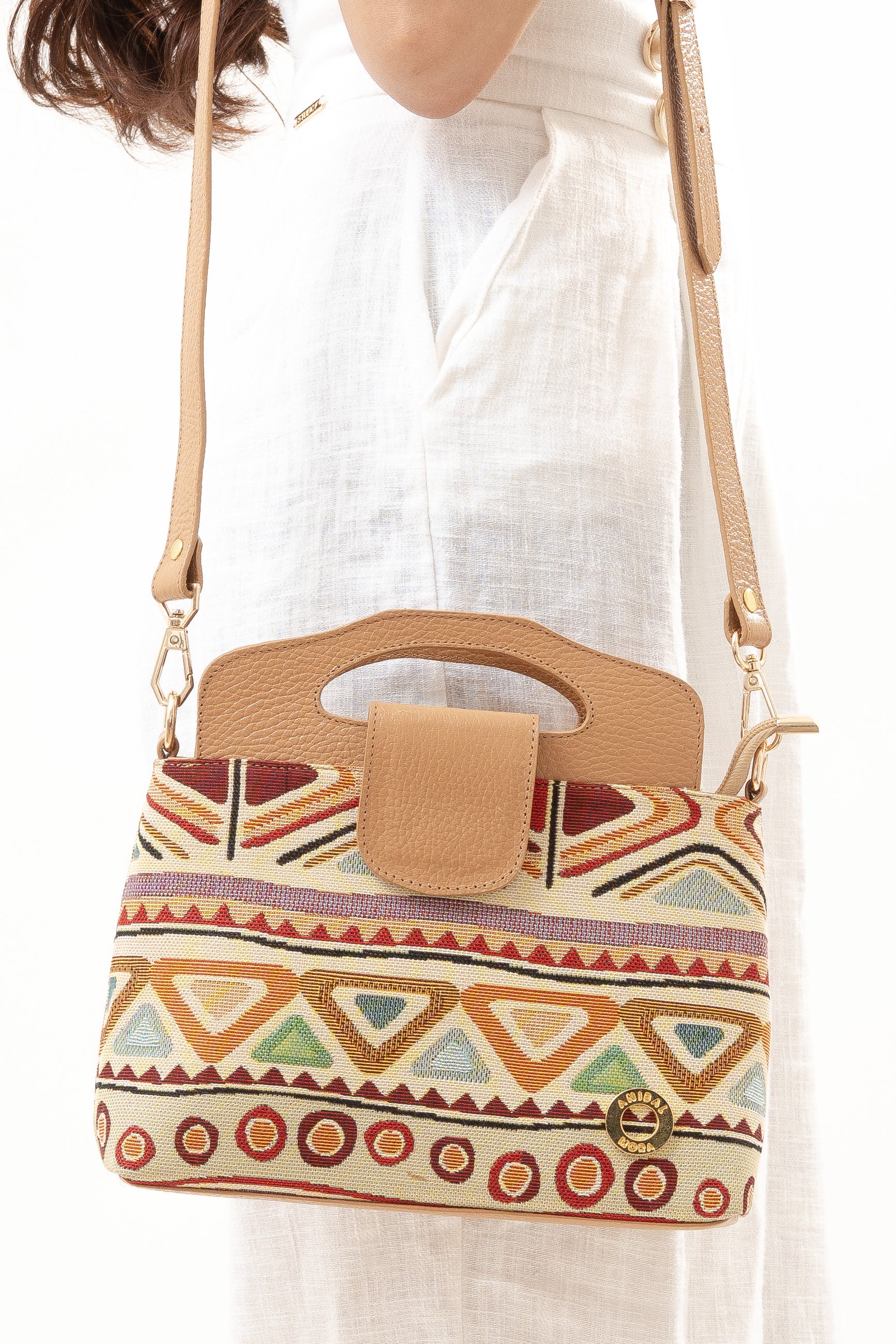 Cuerpo en textil tejido en telar con piezas en cuero complemento ideal,placa circular con el nombre de la marca.